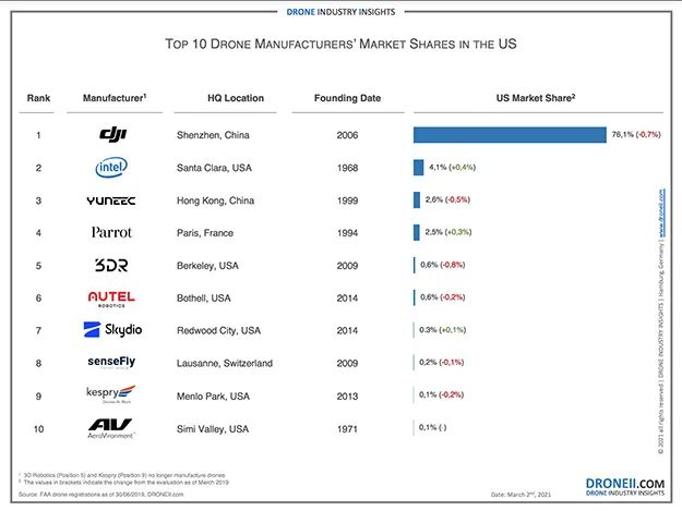 Drone .jp合作伙伴Drone Indusry Insight公司(以下简称DRONEII)公布了2021年度美国无人机制造商市场占有率TOP10。