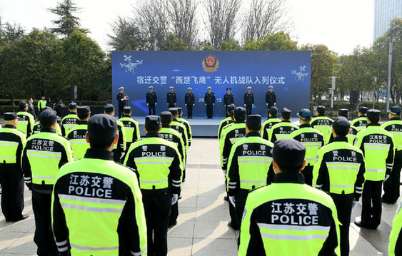 3月12日上午,宿迁交警支队在市人民广场举行宿迁交警“西楚飞鹰”无人机战队入列仪式。