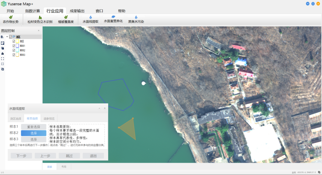 在视图中绘制1-10个多边形作为水体样本,或直接点击 “ 跳过 ” 选样本,程序将自动调用根据数据智能化提取的默认参数进入下一步。