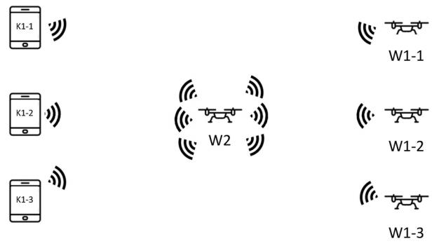 如上图,为这种无人机控制方法的连接示意图,中转无人机W2与多个控制端以及对应的多个无人机进行通信中转,这样,通过解除控制器与无人机只能一对一的通信,可以让信号进行转发,从而增大了无人机的运动范围,使得无人机可以超过控制器的通信范围之外运动,同时也扩展了无人机的使用场景。