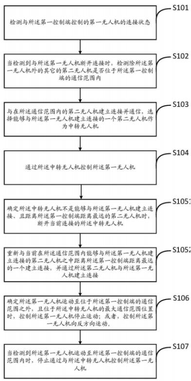 如上图,为该专利中发明的用于控制无人机的流程图,首先,系统监测第一无人机的连接状态,如果监测到无人机断开连接,则会立刻检测其他无人机是否处于该控制端的通信范围内,如果可以检测到该范围内的第二无人机,系统会与第二无人机建立连接并通信,将其选择成为第一无人机的信号中转无人机。
