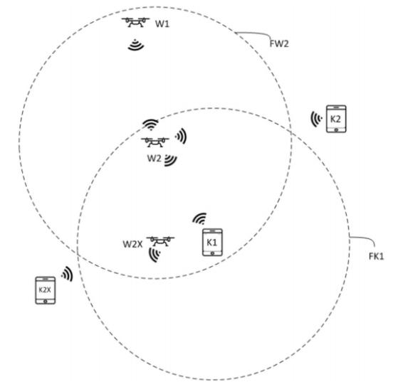 无人机系统包括第一控制端K1以及对应控制的第一无人机W1,该控制端的最大通信范围为FK1,而在K1的旁边,是另个一控制端K2,其控制无人机W2且通信范围为FK2。如图所示,此时第一无人机位于第一控制端的最大通信范围之外,则无法对于该无人机进行控制。