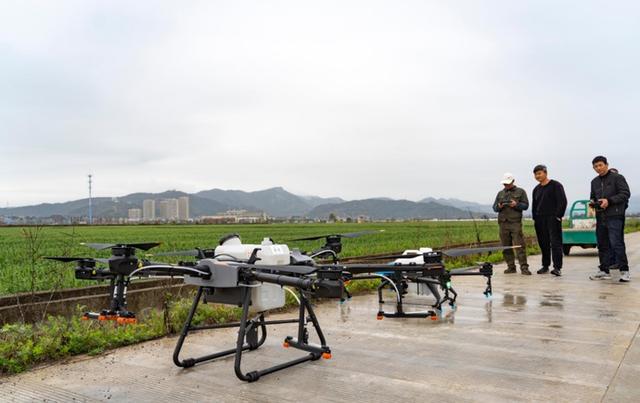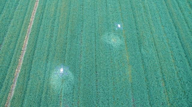 3月18日,在宁波宁海永丰水稻蔬菜专业合作社的1000余亩小麦种植基地上空,2架多旋翼无人植保机正在喷洒丙硫菌唑和戊唑醇农药,防治小麦赤霉病。