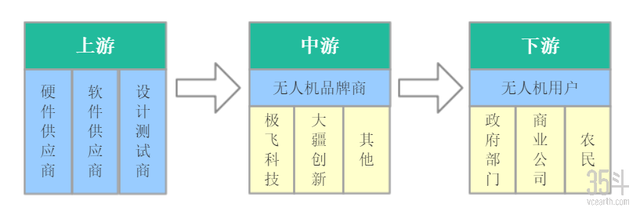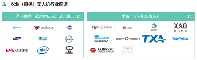 无人机成本为何能逐渐降低呢?整个行业产业链愈渐完善是因素之一。单就农业植保无人机产业链来看,上游供应商与设计测试商,中游农业植保无人机品牌以及下游无人机用户这三块都有了角色(企业等)填充,并且三者之间逐渐形成了良性的合作关系。上游供应商与设计商为中游农业植保无人机品牌商提供硬件设备、软件系统以及设计测试服务。中游农业植保无人机品牌商则为下游参与者提供农业植保无人机产品设备、培训服务和植保服务等。