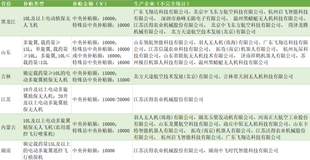 目前全国各主要农业省份除辽宁、河北、山西、海南等省份外都已将植保无人机纳入补贴范围,但补贴的政策和要求有一定差异,15L以上机型补贴金额从1万元至2.5万元不等。