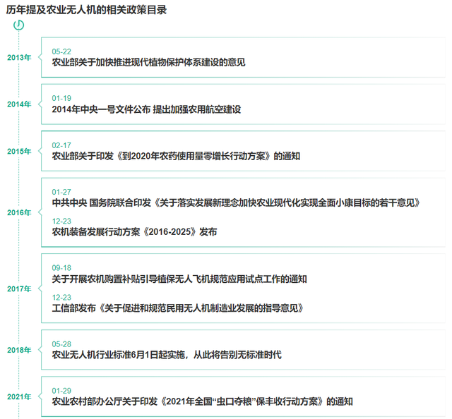 之后,工信部又发布《关于促进和规范民用无人机制造业发展的指导意见》,为推进民用无人机在农林植保等行业领域创新应用,加大农用植保无人机的推广扶持力度,利用首台(套)重大技术装备保险补偿机制、智能制造专项等政策加大对民用无人机产业发展的支持。