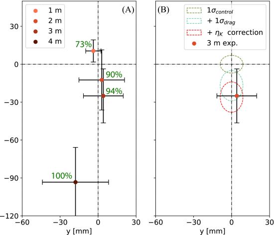 具体到操作上,第一步我们需要增加A值,以达到所需的驱动长度,然后从可用的最小执行器导线直径开始,增加零偏压弹簧的厚度,直到达到所需的初始拉伸为止,再选择次级偏置弹簧,使其欧拉负载高于零偏置负载。其次,我们需要确认SMA的最大应力没有达到迭代,然后减小β,直到Euler负载尽可能接近零偏置负载为止。在实验过程中,研究人员对其进行了80多次的反复测试,可以发现,纵向的精度会随着距离的增加而降低,而横向的精度会受到发射时俯仰偏航和侧倾振荡的影响,但总的来说,随着目标距离增加,下降趋势明显。