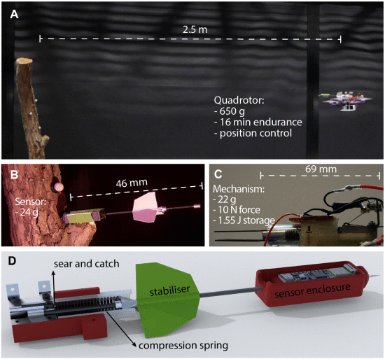 我们还是先来仔细看看这个无人机到底有什么特殊的地方。如下图所示,这个无人机使用了四旋翼配置,最大飞行时间为16分钟,重量为650g。该系统还有一个用来搭载传感器的空间,这需要在起飞前手工进行加载。在后续实验中,研究人员使用了24g传感器吊舱,吊舱包括用于弹簧压缩的元件、飞行稳定器和用于传感器的囊。用于发射传感器的能量则是通过线性弹簧以弹性能量进行存储。