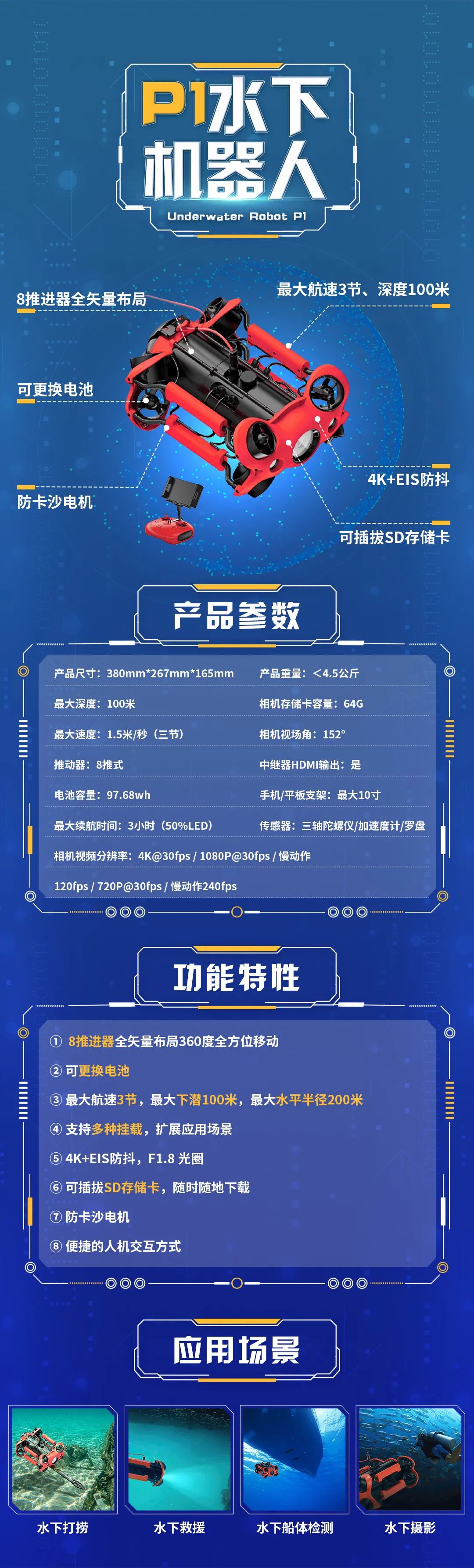 巴中某河段常出现遇难者事故,某救援队伍为了之后能快速响应救援工作,着重分析了该市水域,其属于城区河段,累积淤泥河沙较多,水质较差而且能见度低,通过蛙人打捞也可能极其耗费时间和精力,而且存在一定的风险,因此救援队得出结论,可以通过P1水下机器人打捞来解决这些难题,同时也能获取到更多有效水底信息。在救援队伍到达后,他们发现水域比想象中的更复杂,而且水域辽阔,搜索范围大。但P1水下机器人可以测算水深10米左右,而且搜救半径大。救援人员随即抛出机器人,并通过电动绕线器逐渐放开水下机器人,整体部署时间3分钟,接着其4K影像在遥控器视频上直播了水底状况。通过观察发现河流流经的地质、地理环境较为复杂,河床有淤泥、尖锐的石块等情况,不管是意外溺水还是蛙人下去,都比较容易刮伤。在搜寻当中,P1越往深处走,河底越暗,救援人员随即在遥控上打开了4000流明LED灯,眼前景象随即可以看清,并控制机器人机械手打捞物品。经过高强度长时间作业,机器人打捞了石块等物品,清理了河道大部分堵塞物,同时也分析得出河流均呈南北流向,树枝状分布,水位洪枯变幅大,溪河在枯水期可能有断流的现象,而且水底环境复杂,要提示周边居民切勿在河边玩水。