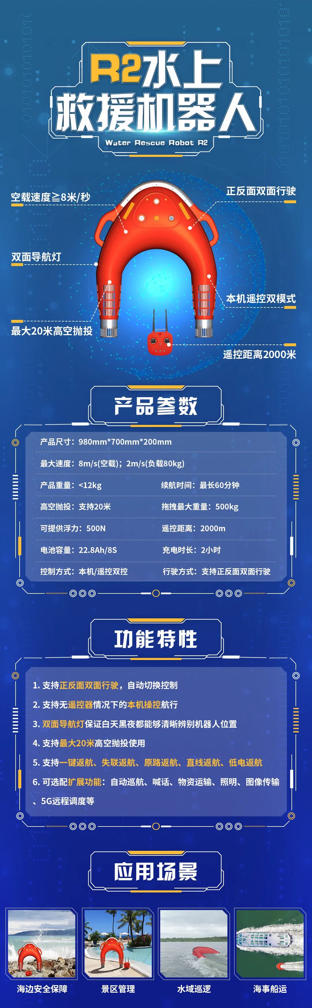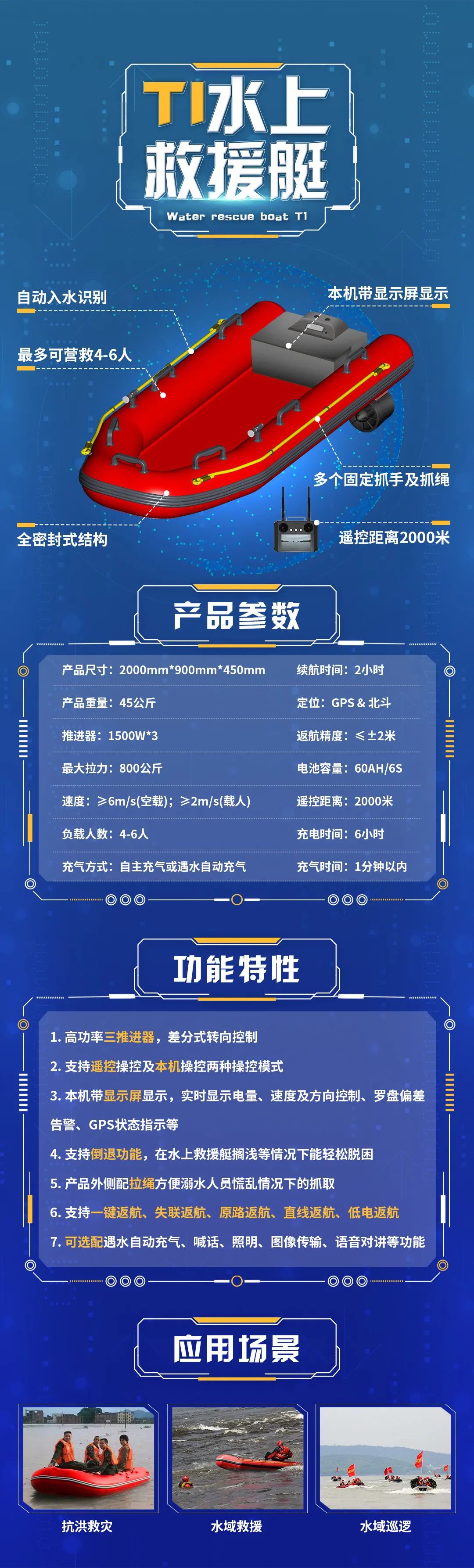 水上救援受地形、外环境变化的影响,救援难度也不一样,比如,在寒冷天气中的溺水救援。救援人员则可以通过抛投水上救援机器人,让其立即出发,在最短的时间内让溺水人员抓住机器人,获得呼吸的机会,并由机器人带回岸上。又或者,为了应对雨季发生的洪灾,使用水上救援艇,实施大规模救援,保障生命。