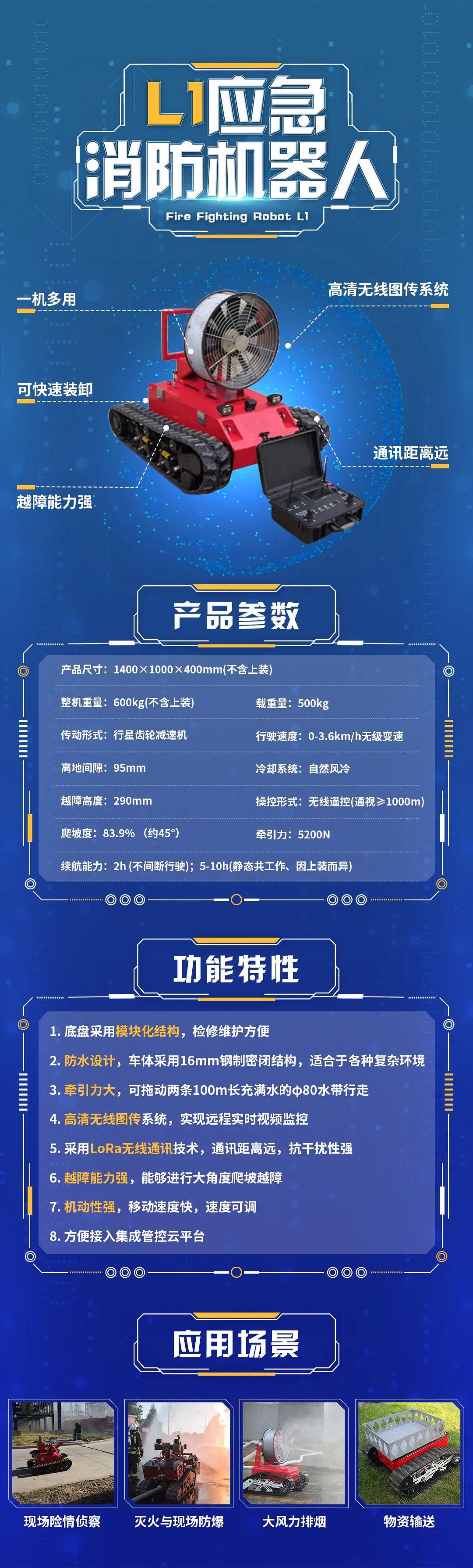 从19世纪末开始全球开始气温升高,平均气温上升了0.3~0.6度,随之而来的是一系列的环境灾害,而火灾就是其中一种。每年,在不管是成功营救或者是损失的数字背后,都是以一条条消防员/受害者生命所叠加而成的。而无人化消防救援解决方案却能够为此带来低损失成本和高灭火救灾效率。L1应急消防机器人,它能够充当消防员进行现场险情侦察、紧急灭火、大风力排烟、探测巡检、物资输送、现场防爆。