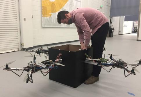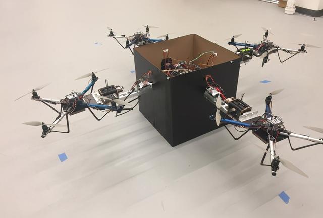 韦伯和罗杰斯进行了一次演示,其中四架小型四旋翼无人机协同工作,将一个2英尺x 2英尺x 2英尺的箱子举起,重12磅。罗杰斯说,控制算法不仅限于四辆车,而且可以管理“尽可能多的车”。