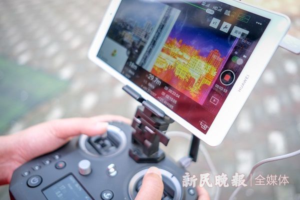 昨天下午2时,阳光明媚,正是无人机工作的好时机。轻击按键,无人机匀速起飞,向前方一栋18层的住宅楼飞去。飞手(无人机操控人员)的遥控器与平板电脑相连接,屏幕上呈现出的是一幅二分屏的画面:左半边是无人机实时拍摄到的地面实景图像,右半边则是明明暗暗的红外热成像画面。