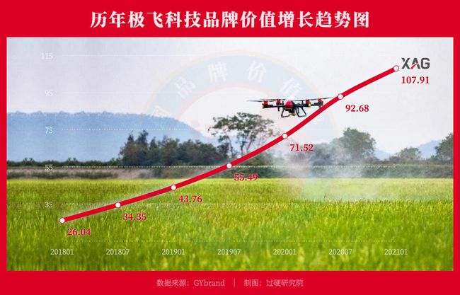 据过硬研究院统计数据,2018年1月,极飞科技品牌价值虽然只有26亿人民币,但是增长速度惊人,2021年1月达到了107.91亿人民币,仅仅三年时间就增长了314.4%。