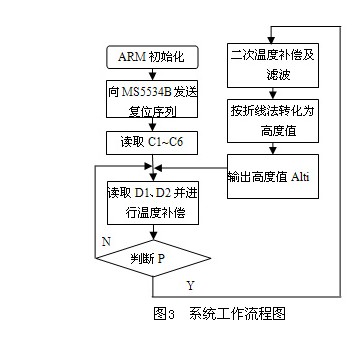 每个MS5534B在出厂时都有一个针对模块特有的四个Word校准数据,储存在64位的PROM中。ARM7微处理器在初始化以后通过串口从MS5534B中读出Word1~Word4,然后运用逻辑移位操作方式转化为6个校准补偿系数C1~C6。ARM7微处理器从MS5534B不断读取绝对气压值D1和温度值D2,然后结合校准补偿系数计算求得相对气压值P,判断其是否在有效范围内,对有效值进行低通滤波处理,最后按折线法转化为海拔高度值。将高度值通过与飞控系统相连接的无线数据传输模块实时传输到地面站,实时掌握飞机的飞行高度,对出现的意外情况可以及时处理[5]。基于MS5534B的高度测量系统的软件流程图3如下所示。