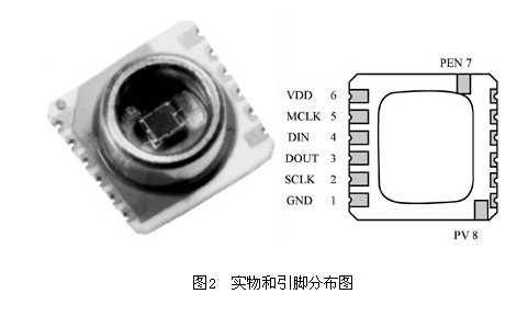 ARM7微处理器与气压传感器间的通信通过标准SPI接口完成[4]。DOUT、DIN分别是数字输出、输入引脚,SCLK为串行数据时钟,MCLK为主频32.768kHZ的系统时钟,由微处理器提供。MS5534B数字输出的参考电压是3V供电电压,外接的4.7uF钽电容应尽量靠近MS5534B,以保证数据转换时的供电稳定和转换精度。模块实物和引脚分布图如图2所示。