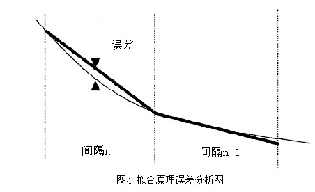 在实际应用中,大气压力与海拔高度的关系是非线性的[6],传统的方法是将气压值与对应的高度值做成数据表,运用查表的方式,如果精确到1m,则需要上万个数据,需要庞大的存储空间,且耗时较大,另外由于飞控系统中微处理器对大量浮点运算的能力不是很强,并且飞控系统对实时性要求很高,为了节省宝贵的存储空间,所以本系统设计运用折线法进行线性拟合[7]。折线线性拟合法的基本思想就是将被逼近的函数曲线根据变化情况分成多个间隔区域值,为了提高精度及缩短运算时间,各间隔域值内可根据精度要求,采用不同的斜率线性线段表示曲线线段。拟合原理误差分析如图4所示。