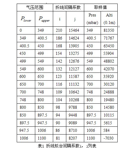 其中,alti表示海拔高度(0.1m),pres表示气压值(mbar),j,i表示折线间隔系数。在不同的i,j取值范围内,大气压向高度转化时是线性的,提高了转化的时间,误差是周期性的,且在一个小的范围内。将正常的工作高度范围内分成不同的多段,会得到不同的高精度值。i,j的一种分段列表,如表1所示。