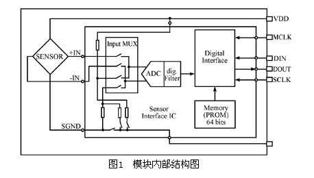 MS5534B是一种低电压、低功耗、高精度的测压力模块,其中包含一个压阻式压力传感器和一个15bit的ADC集成模块,具有数字输出功能,它可以提供16位的气压和温度数字信息,压力测量范围10~1100mbar,分辨率为0.1mbar。另外,传感器有六个软件校准系数,压力绝对精度为+/-1.5mbar,相对精度为+/-0.5mbar,并且不需再接其他外围模块,接口简单,电路连接方便。该模块尺寸很小,平面尺寸为9mmX9mm,厚度仅为3.7mm,可以在-40°C到+125°C环境中应用[3]。模块的内部结构图如图1所示。