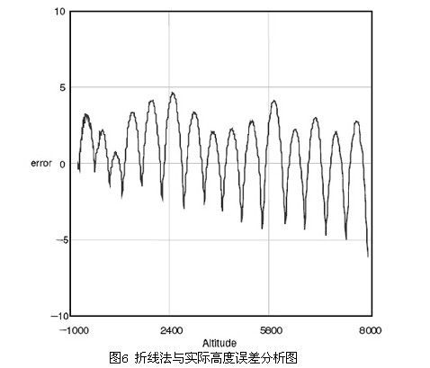 图6为在海拔-700m~8000m时,运用Matlab仿真折线拟合法所得海拔高度与我国标准大气压对照高度误差示意图,在-700m~8000m时最大高度误差为+/-5m,而在-100~1000m时的误差在+/-3m以内,适合小型无人机的高度需求。