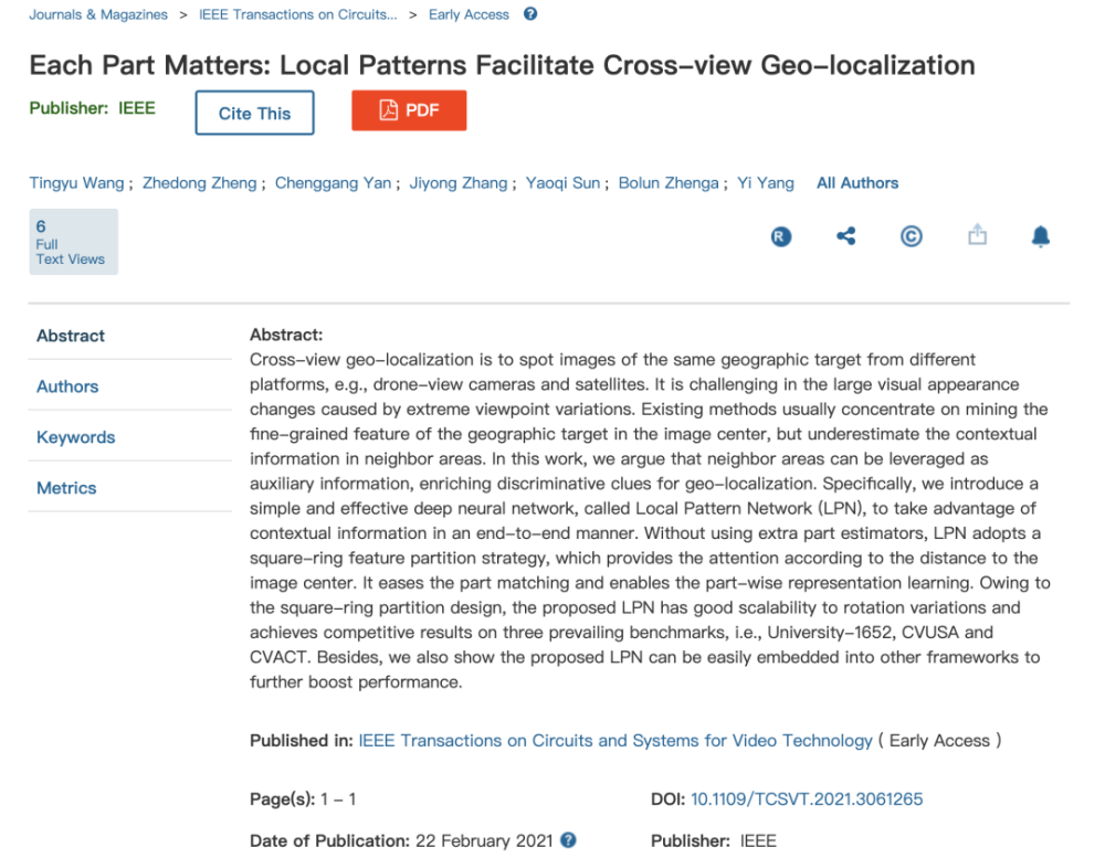 疫情期间,为了实现“无接触”,无人机送货成迫切需求。但无人机送货也面临“找路”难题,比如在局促小区,要把快递送到某幢楼某单元门口,鉴于这幢楼和相邻楼外形相似,甚至两幢楼相邻参照物也极为相似,无人机导航很容易迷航。我校自动化学院(人工智能学院)智能信息处理实验室博三学生王廷宇题为《Each Part Matters: Local Patterns Facilitate Cross-view Geo-localization》的论文,提出“交叉定位”方案,有望解决这一工程技术难题。这篇论文发表在《IEEE TRANSACTIONS ON CIRCUITS AND SYSTEMS FOR VIDEO TECHNOLOGY》期刊,为SCI一区期刊。