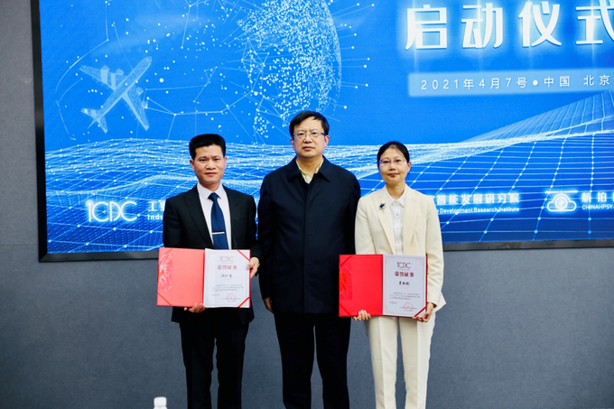 罗民为无人机人工智能发展研究院陈水宝常务副院长和吴丽群副院长颁发荣誉证书