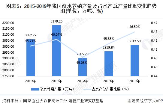 淡水养殖方面,数据显示,2019年,我国淡水养殖产量为3013.59万吨,同比增长1.82%;淡水养殖产量占比水产品总产量比重约46.50%。