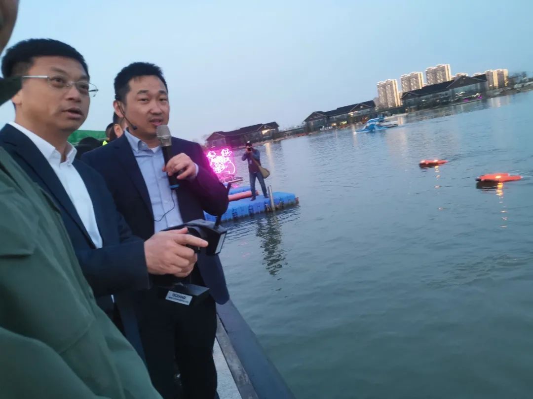 曹路宝市长在工作人员的指引下进行“海豚1号”水面救生机器人操控体验,并于当晚和港科大校友一起现场观看由82艘云洲无人船担纲主演的大型实景演出《船说海棠》。