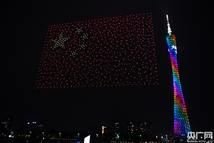 1000架无人机组成五星红旗,飘扬在海心沙上空(央广网记者 官文清 摄)