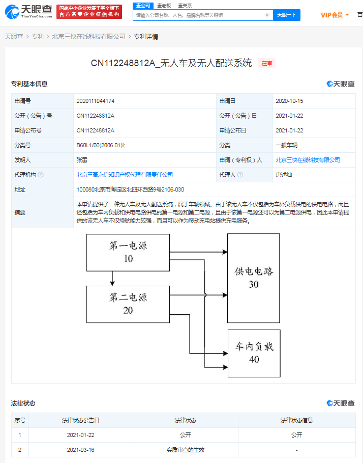 北京三快在线科技有限公司已公开“无人车及无人配送系统”“一种无人机配送系统、能量消耗优化方法及无人机”等多项相关专利,此类专利状态多为“实质审查”。同时已登记“无人配送车控制功能软件”等相关软件著作权。