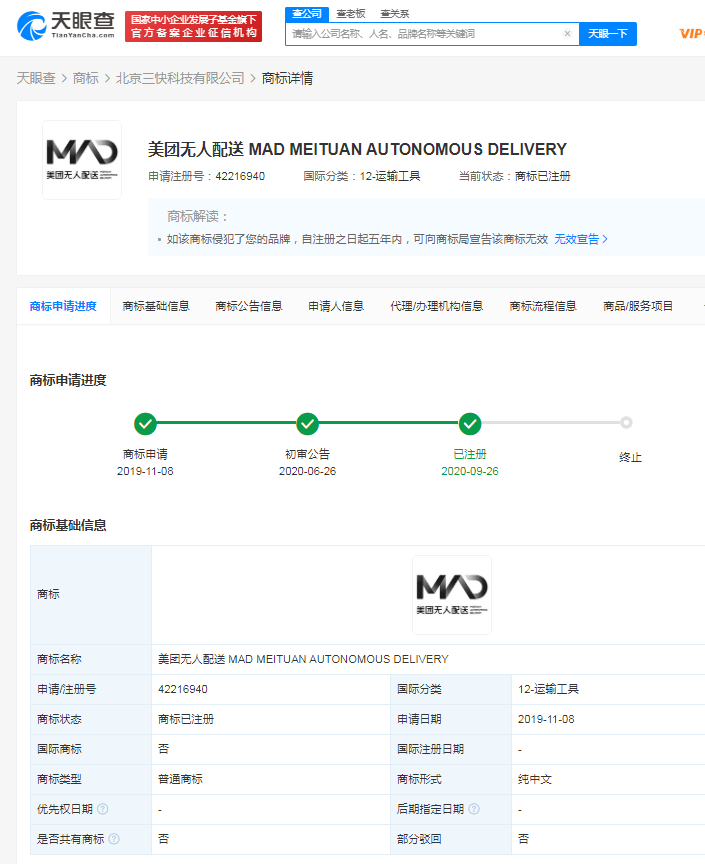 天眼查App显示,美团关联公司北京三快科技有限公司近年来已陆续申请“美团无人配送”“美团无人微仓”等多个商标,国际分类涉及运输工具、科学仪器、通讯服务等,目前商标状态均为“商标已注册”。
