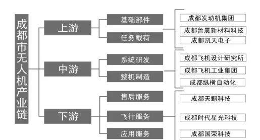 其中上游包括成都发动机集团、成都凯天电子等为代表的从事无人机基础部件制造生产的企业,中游以成都飞机设计研究所、成都纵横自动化等为代表的从事系统研发和整机制造的企业,下游以天麒科技、成都时代星光科技等为代表的从事工业无人机售后服务与应用服务的企业。