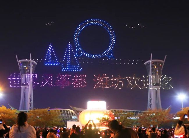 接下来的无人机秀更是高潮迭起,精彩不断。潍坊风筝的典型代表龙头蜈蚣风筝在空中如巨龙腾飞,引得观众不断拍手叫好。滚地龙风筝、凤凰风筝、展翅翱翔的木鸢、章鱼风筝轮番登场,令人目不暇接。