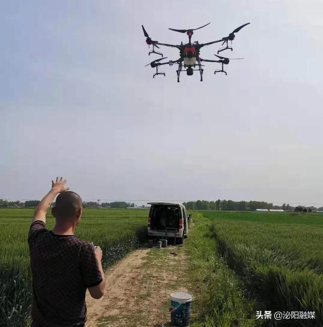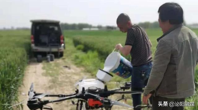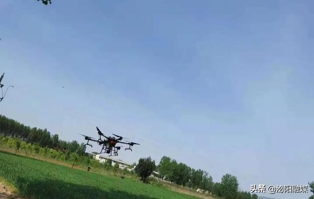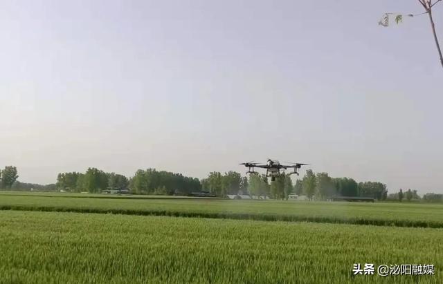 4月17日,天气晴朗,泌阳县115万亩麦田中,一架架植保无人机腾空而起,在麦田上空洒下纷纷细雨,这些带有微微刺激性气味的药水正是此时小麦急需的灵丹妙药,对前期条锈病有治疗作用,对后期赤霉病有预防作用。而各乡镇,还有不少或开着打药车、或身背药桶的农户,忙着给小麦打药,到处呈现一片紧张忙碌的场面,泌阳县小麦生长后期病虫害防治工作全面展开。