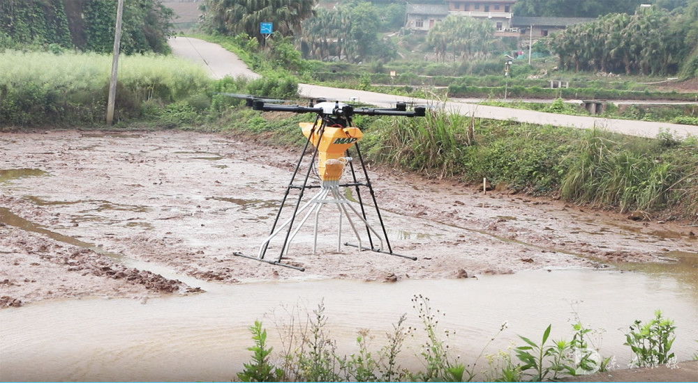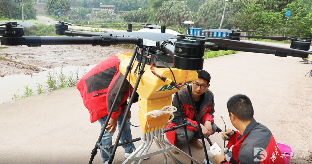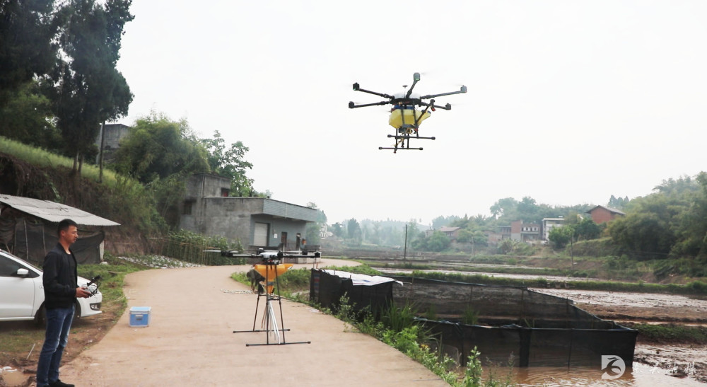 在内江东兴区郭北镇青台村飞播现场,技术人员把种子装进无人机,无人机起飞后将一粒粒种子均匀地撒播到农田里,只用5分钟就完成一亩稻田的播种;此外,专业人员还现场配备药水,通过无人机现场为水稻喷洒专门定制的无毒农药进行封闭式除草。