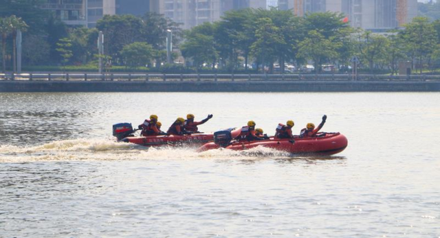 水域救援演练,香洲区消防救援大队通过指令下达、精准定位、实施救援、安全返航等步骤远程操控无人艇(消防船)营救落水人员,通过橡皮艇U型走线、S型走线救援展现复杂水域作战技巧;蓝天救援队、民安救援队练通过抛绳枪展示、水上机器人救援、无动力翻舟自救、机动橡皮艇拖拽救援、橡皮艇离心力(O型)抓拽救援等项目完成联合演练,展现了香洲区防灾救灾应急响应机制和多方救援力量的专业性。