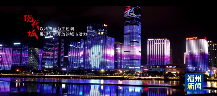 以科技蓝为主色调,配合《我们都是追梦人》奋进奔放的旋律,运用“数娃”、航空、海港等现代元素,展现福州创新开放的城市活力。