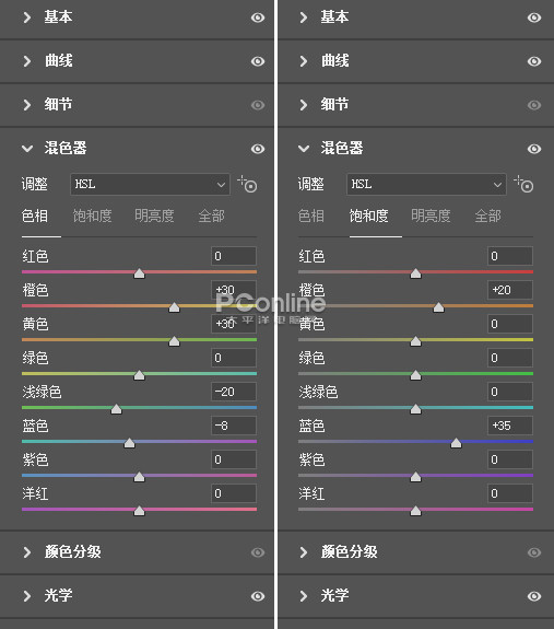 之后我们再针对画面的夕阳和天空的青色,调整一下。主要是橙色色相和饱和度偏右,蓝色饱和度要增加一些,就完成了。