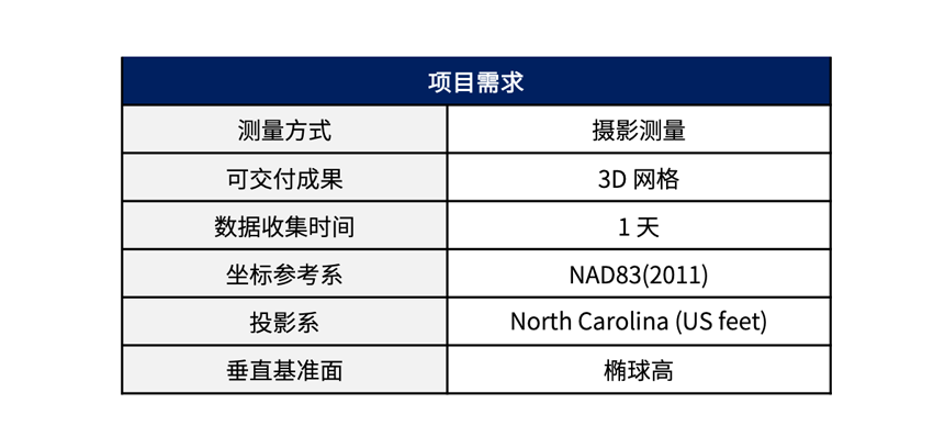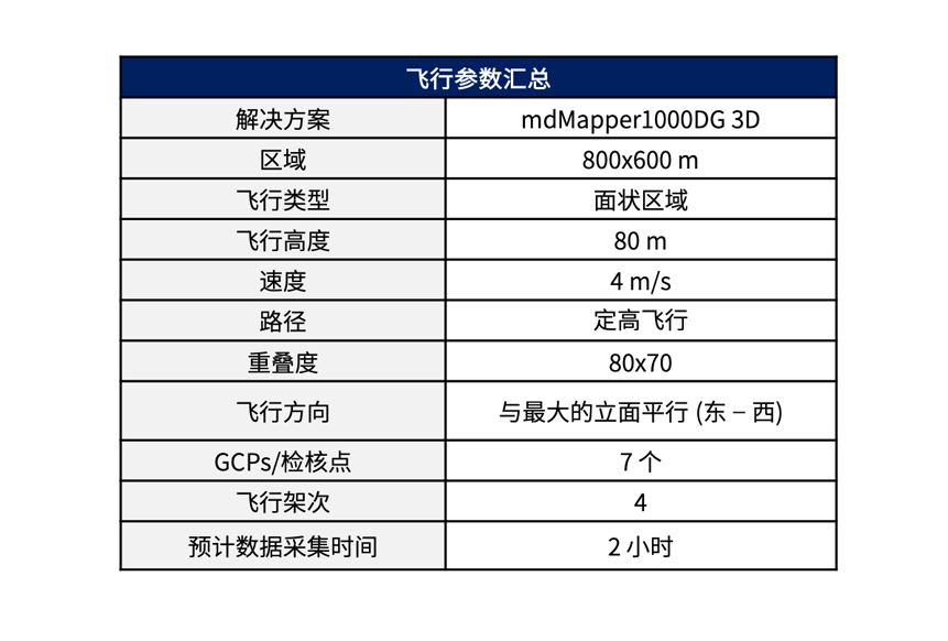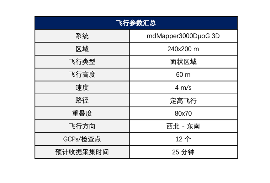 测试人员使用 mdMapper3000DμoG 3D 系统飞行了1个架次,速度为每秒4米,采用60米的恒定飞行高度。飞行时间为25分钟,重叠度 80x80。下图为该项目飞行参数汇总表。