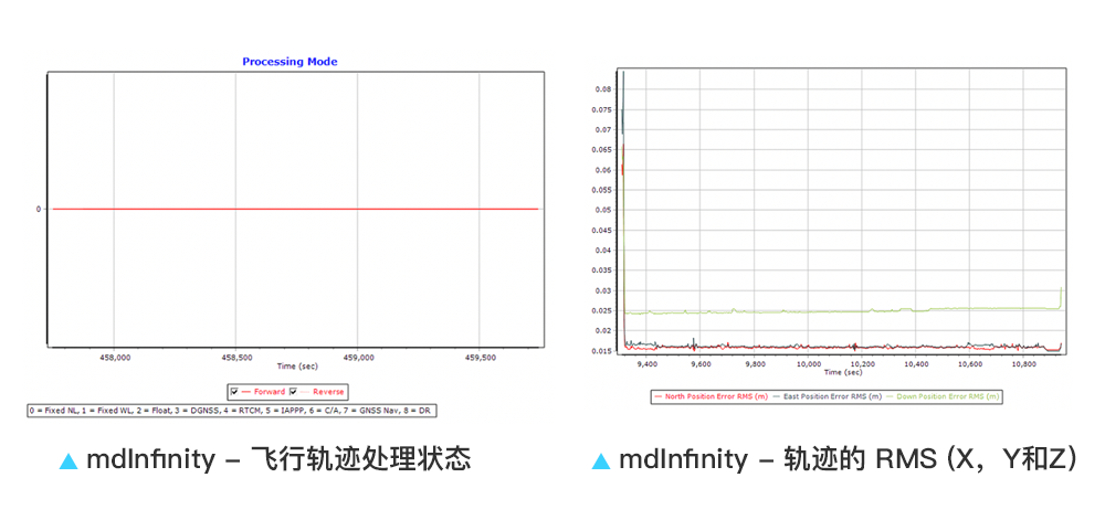 获取数据后,使用mdInfinity数据处理平台进行轨迹处理。可以看到,每个架次飞行期间,IMU(惯导系统)测量均保持链接,没有间断。