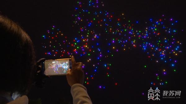 晚上8点,由500架无人机组成的无人机方阵缓缓升空,先后组成扬州世园会会徽绿扬梦双花、吉祥物康康和乐乐、中国馆、扬州五亭桥等图案,以及“扬州世界园艺博览会”“扬州是个好地方”“仪征枣林湾欢迎您”等字样,引得现场游客纷纷拿出手机记录这一绚丽时刻。