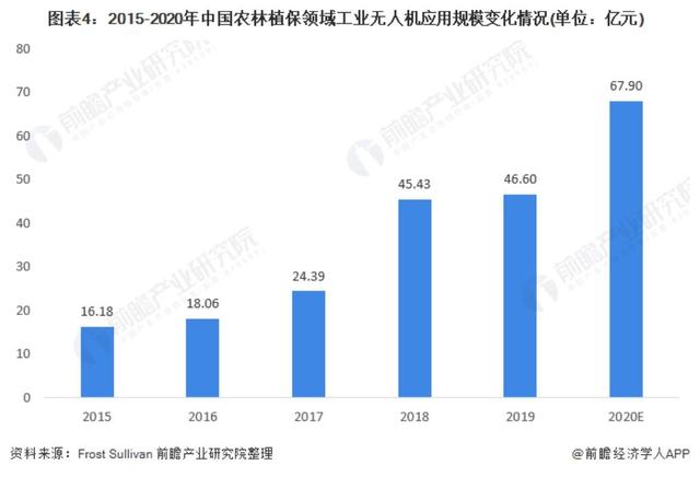 2015年以来,我国农林植保领域工业无人机市场规模逐年上升,2019年达46.60亿元。在疫情、春耕、5G等多方面因素影响下,2020年植保无人机再度迎来爆发,不管是无人机数量、种类还是应用、市场都实现跨越式发展,2020年市场规模约达67.9亿元。