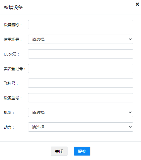 设备昵称根据需要自定义,使用场景根据需要任意选择,将UBox上的SN号填入UBox号,实名登记号是在民航局实名制登记系统(https://uas.caac.gov.cn)上将无人机登记获得的UAS开头的数字,填写使用的无人机的飞控号(在无人机飞行APP里可以查看,无法查询的可以根据需要自定义)、设备型号(例如大疆M600)、机型(例如多旋翼)、动力(例如电动)。