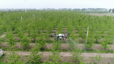 咱们这个树啊,它是风媒花,它全靠这个风。如果阴天下雨,湿度太高,很难散粉,我们用这个无人机给它大面积,集中时间喷施,保证充分授粉,基本上不受阴天下雨的影响,那就能保证我们今年秋天有一个很好的收成,产量增长百分之二三十肯定是没问题。