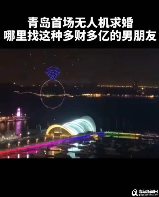 据这场求婚的策划者文文介绍,青岛奥帆中心进行这样浪漫的无人机求婚,尚属首次。她表示,“这一次是由150台无人机拼成的巨幅画面,准新郎是在海尔洲际酒店天台上完成了这场浪漫的求婚,那里也是观看无人机表演的最佳位置。此外,这次求婚提前一天就在短视频平台上进行了预热,近万名网友对这场求婚进行了围观。”