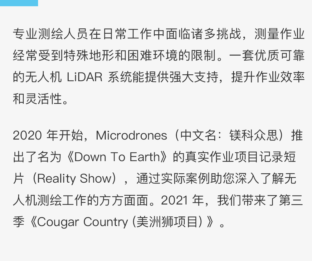 2021年,Microdrones 推出全新一季《Down To Earth》系列无人机 LiDAR 项目真实记录短片,聚焦 Cougar 施工团队的故事:在面对佛罗里达州变幻莫测的天气、忙碌的工地和隐藏的作业危险时,他们如何使用无人机 LiDAR 技术收集现场数据、制作工地地形图、通过高质量数据优化作业流程的全过程。让我们跟随摄制团队,体验 Cougar 团队日常工作中遇到的实际困难和应对方法吧!