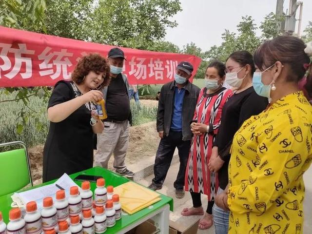 和田市农业农村局高级农艺师布再娜普·艾力正在给村民现场培训药剂防治注意事项。