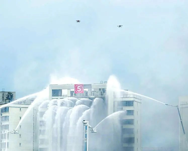 确定路线后,救援人员展开内救外攻。绵阳专业队无人机群随即升空,1号无人机向高层被困人员投掷防护和救生器材。随后,2号无人机悬停在楼顶空域,向下投放灭火弹,3号、4号无人机分别向楼内展开泡沫灭火剂喷射作业和干粉灭火剂喷射作业。