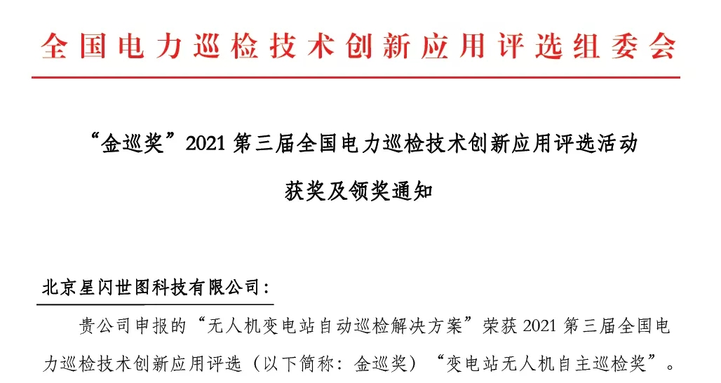 近日,第六届全国无人机电力巡检技术高峰论坛及第三届全国电力巡检技术创新应用评选(金巡奖)活动圆满落幕,海淀创业园星闪世图申报的“无人机变电站自动巡检解决方案”荣获“变电站无人机自主巡检奖”。