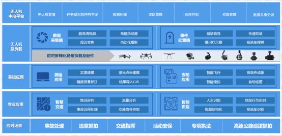 由采集端、无线传输层、应用层、平台层等组成的无人机交警应用解决方案体系,构成了智慧交警的应用闭环。